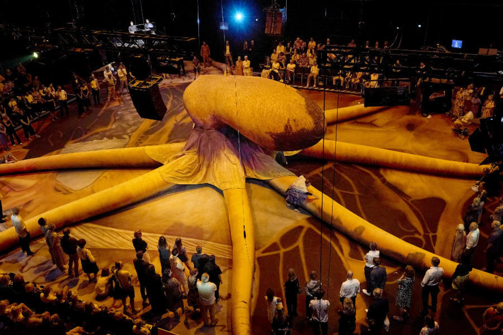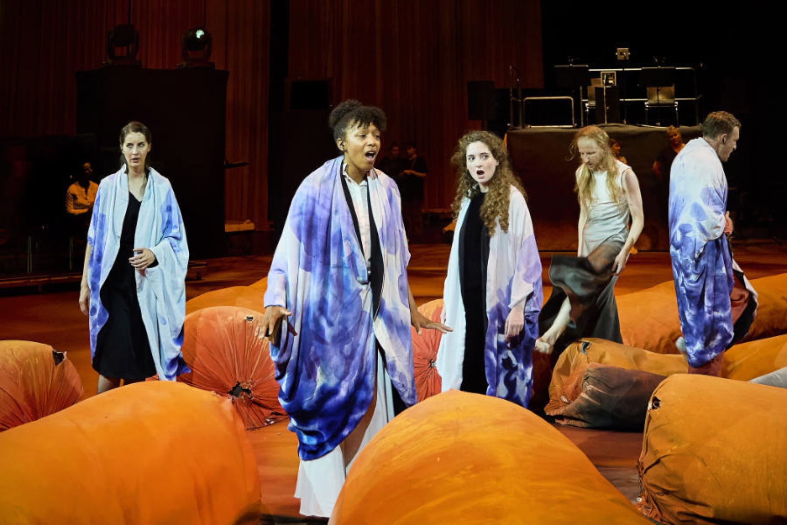 I am very proud of Breathwork as a standalone piece, but it also proved incredibly helpful as a litmus test for certain logistical and musical approaches to Hold Your Breath. The two operas have completely different visual landscapes but their soundscapes are similar. In both cases I have made a big effort to play with sound localisation and identification. The singers were not amplified in Breathwork, but their voices did appear in the underlying electronics jumping between all four corners of the room. The audience were also seated in a circle with the singers surrounding them, allowing for each audience’s visual and auditory experience to be slightly different from one another. Both the scale of the room and audience were much larger for Hold Your Breath but I wanted to achieve the very same thing; to play with the amplification location of each sound/singer/musician and allow for each audience member’s auditory experience to be different. I think this may have been more successful in Breathwork as in Hold Your Breath we had a combination of both seated and roaming audience. The scale of the venue in general was a big challenge with Hold Your Breath, and I don’t think the performance would have functioned without conductor Karen Ní Bhroin. Karen was brought on as a conductor and musical director for Breathwork, and although the final performances didn’t require a conductor in the room, Karen’s involvement was invaluable in rehearsals. I very quickly realised that her skill sets would be very necessary in the Bregenz production, and thankfully she was available and willing to jump on board.